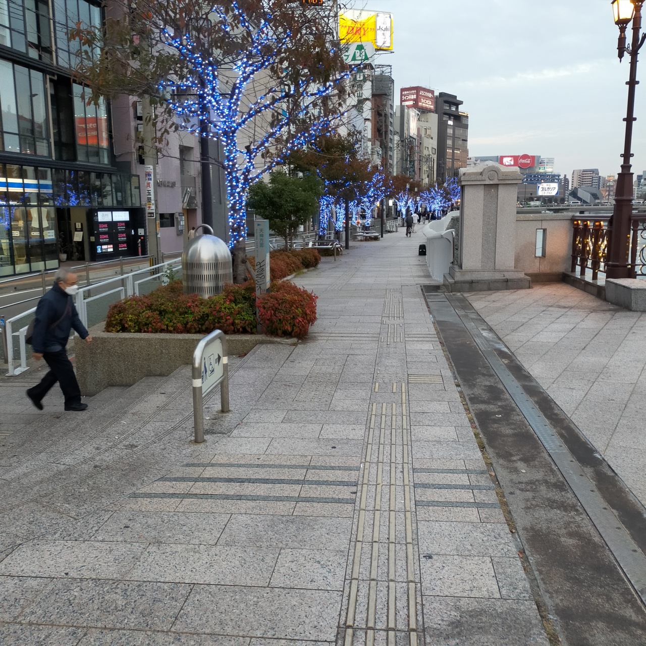 川岸に植えられている葉の落ちた街路樹はイルミネーションでライトアップされていて、日が落ちる夕刻になるときれいでした。観光船の天井には絵が描かれていたりして、興味深く見たり、川岸のビルの様子など都会らしい風景でした。
