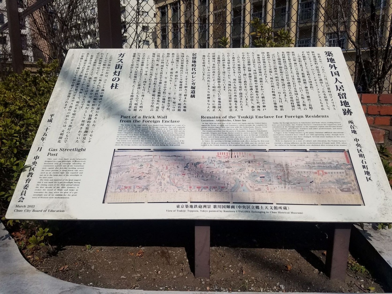 居留地通りと居留地中央通りの交差点に説明板がありました。明石小学校の校庭の所ですね。外国人居留地というと開港した横浜を思い浮かべますが築地にもあったのですね。横浜と比べて宣教師や医師、教師が多かったとのことでキリスト系の学校の発祥の碑がそこここにあるのも合点がいきました。