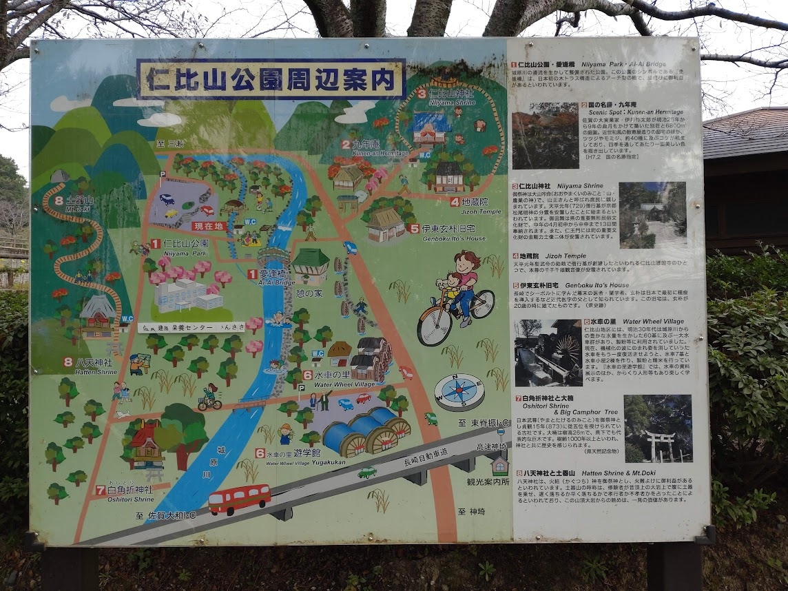 山に囲まれた川沿いに広がる自然公園です。桜や紅葉の季節には人が訪れ、キャンプを楽しむ人もいるようですが、ふだんは人気がなくひっそりしていました。公園マップを見ても神社やお寺が点在している程度で見どころが少なかったです。