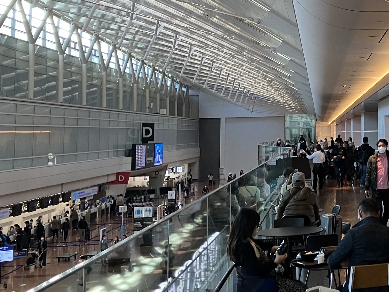 羽田空港第2ターミナルビル3階、南側チェックインカウンターを見下ろす細長いグルメフロアです。トルコ料理のケバブをはじめ中国、韓国、ベトナム、イタリア、日本の各国の料理、そして世界のワインの店が並ぶフードコートです。また世界のさまざまなブランドチェアがさりげなく並んでいます。まるで北欧の空港のようです。