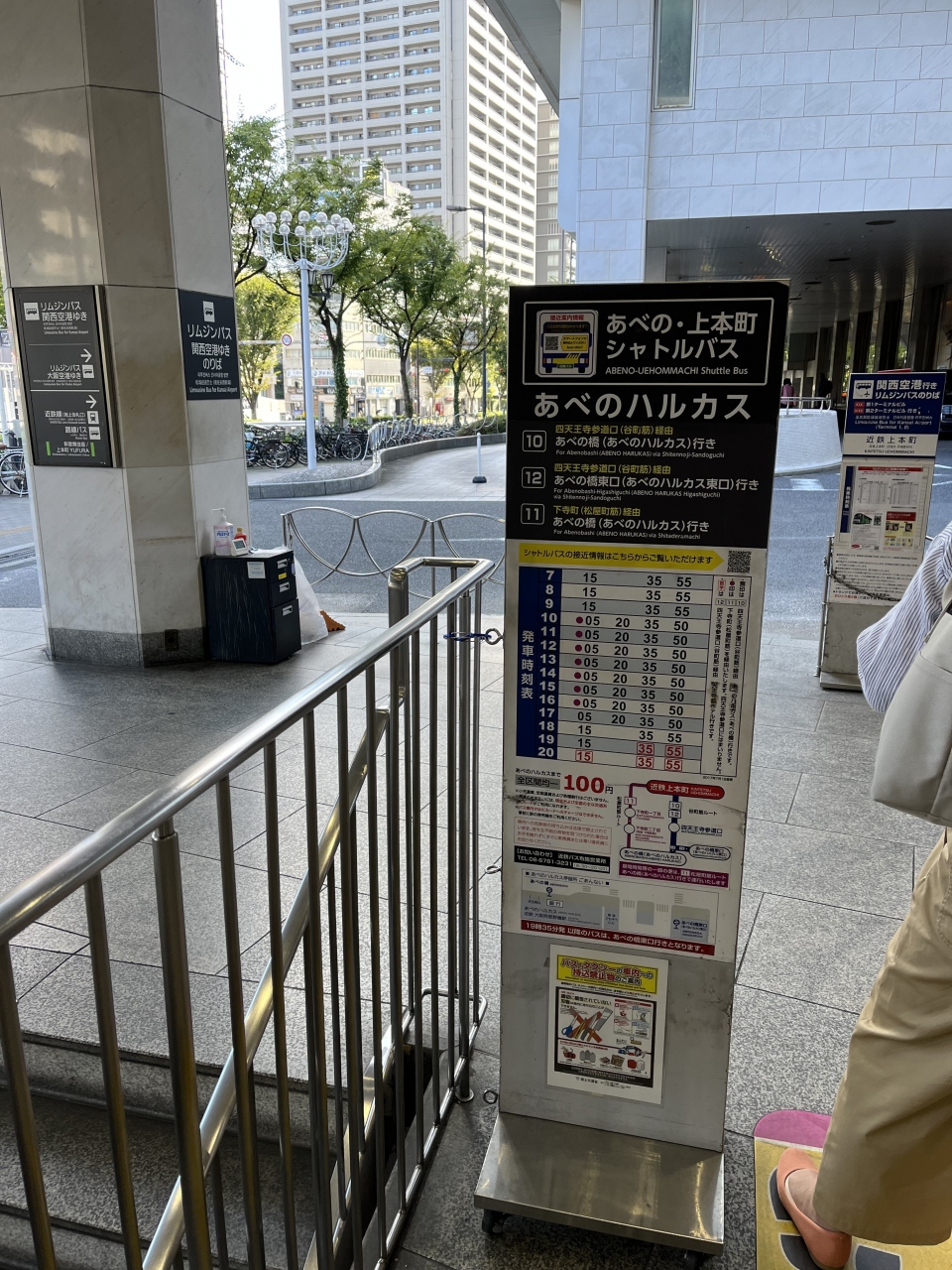「あべの・上本町シャトルバス」を利用しました。近鉄上本町駅からあべのハルカスまで、100円で運行されています。どちらにも近鉄百貨店があるので、シャトルバスとして運行されているようです。15分に1本運行されていて使い勝手が良かったです。途中、四天王寺も経由しますし、観光客にも便利な路線です。