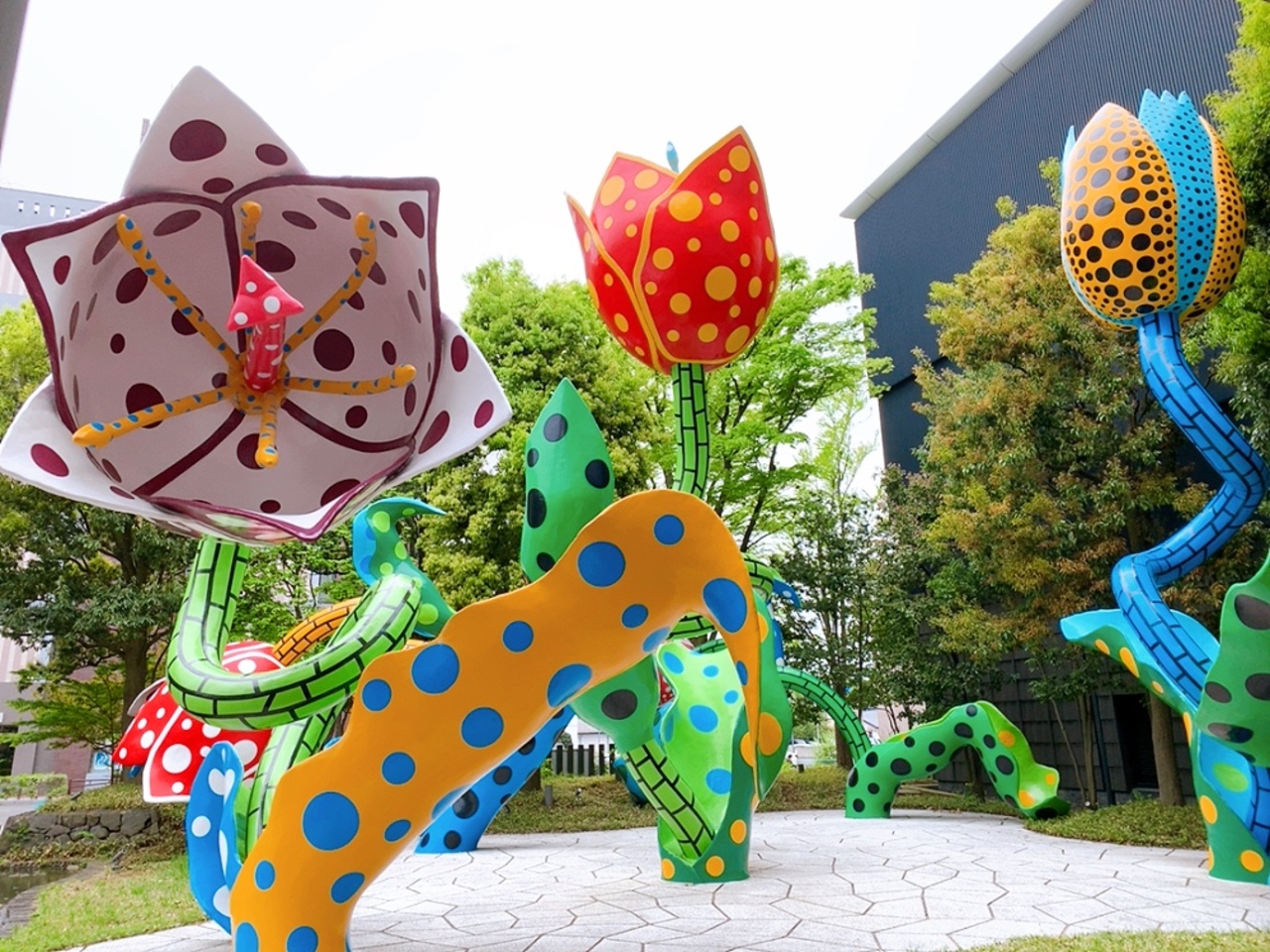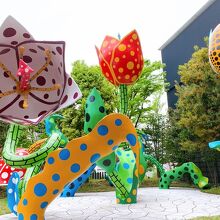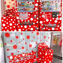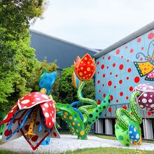 美術館に入場しなくても誰でも見れて、撮影も出来る、庭園の草間彌生作品が出迎えてくれます。 花をモチーフにしたエキセントリックな作品です。 コカコーラの自販機の上段までも、アート草間作品になってるのが凄いと思いました。