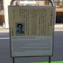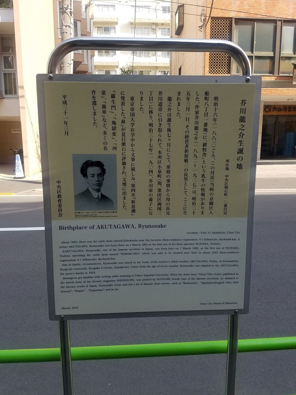 居留地通りの築地川公園寄りの歩道に説明板がありました。唐突に芥川龍之介の名前が出てきたのでちょっとびっくりしました。芥川というのが養子に入った先の苗字だったというのも知って二度びっくりしました。養子先の地である両国にも芥川龍之介がらみの史跡があるようなのでまだ行ったことのない両国を訪れる動機付けができました。
