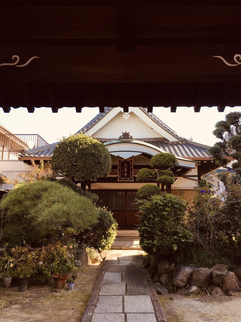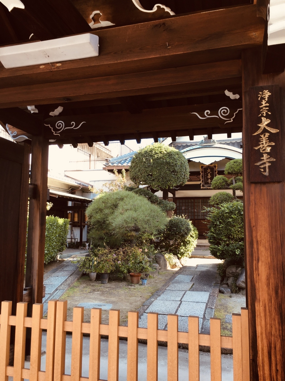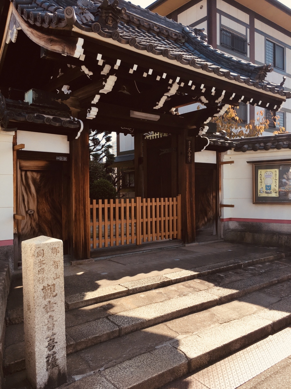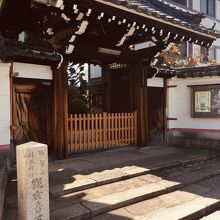 観世音菩薩と記載された小さな石碑が門前にありました。寺が固まっている場所の道沿いにあり白い壁の上には瓦屋根が繋がっていました。門の左右するにも扉があり、門の前には柵がありました。庭が綺麗な境内で植木鉢がいくつか置いてありました。