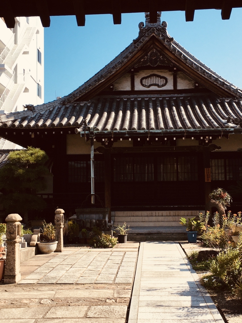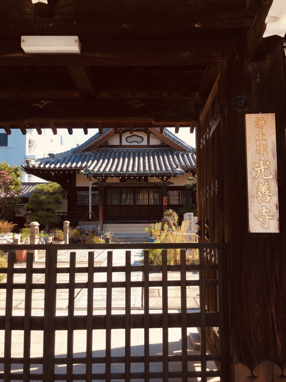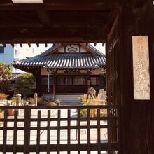 木の門で少し年季が入っているように見え、右側には寺の表札が金色でした。門の前には柵があるので一般客は入ることが出来ず、門前から境内を見学しました。石の道が本堂まで続き、植木鉢や草木が生え、賽銭箱はなかったです。