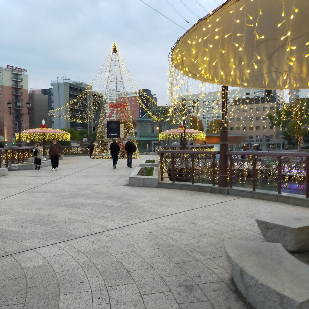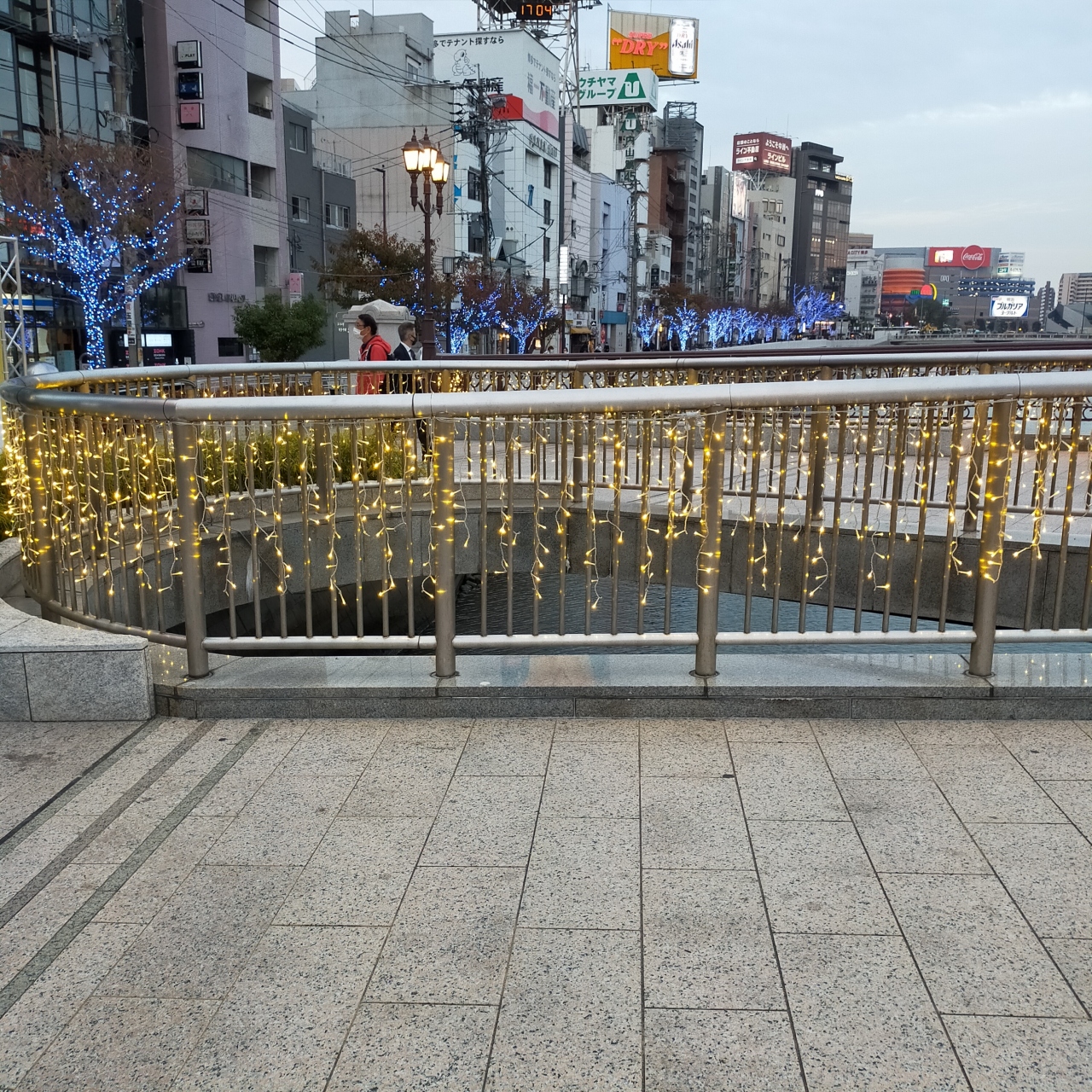 旧福岡県公会堂貴賓館の正面の那珂川に架かる橋で夕方5時頃に行ったのですが、丁度日が暮れかかって薄暗くなる頃で、那珂川の様子を楽しみながらゆっくりと渡、少しずつイルミネーションがつき始め、渡り切って振り返るととても美しく飾られていました。