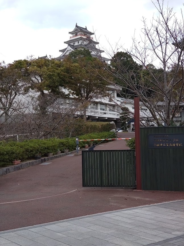 海に突き出た岬のてっぺんにある城です。空に向かってそびえたつように見えて美しい形をしていました。麓にある早稲田付属中学・高校の白壁はこの風景によく調和していて、主役の城を支える名脇役になっていました。