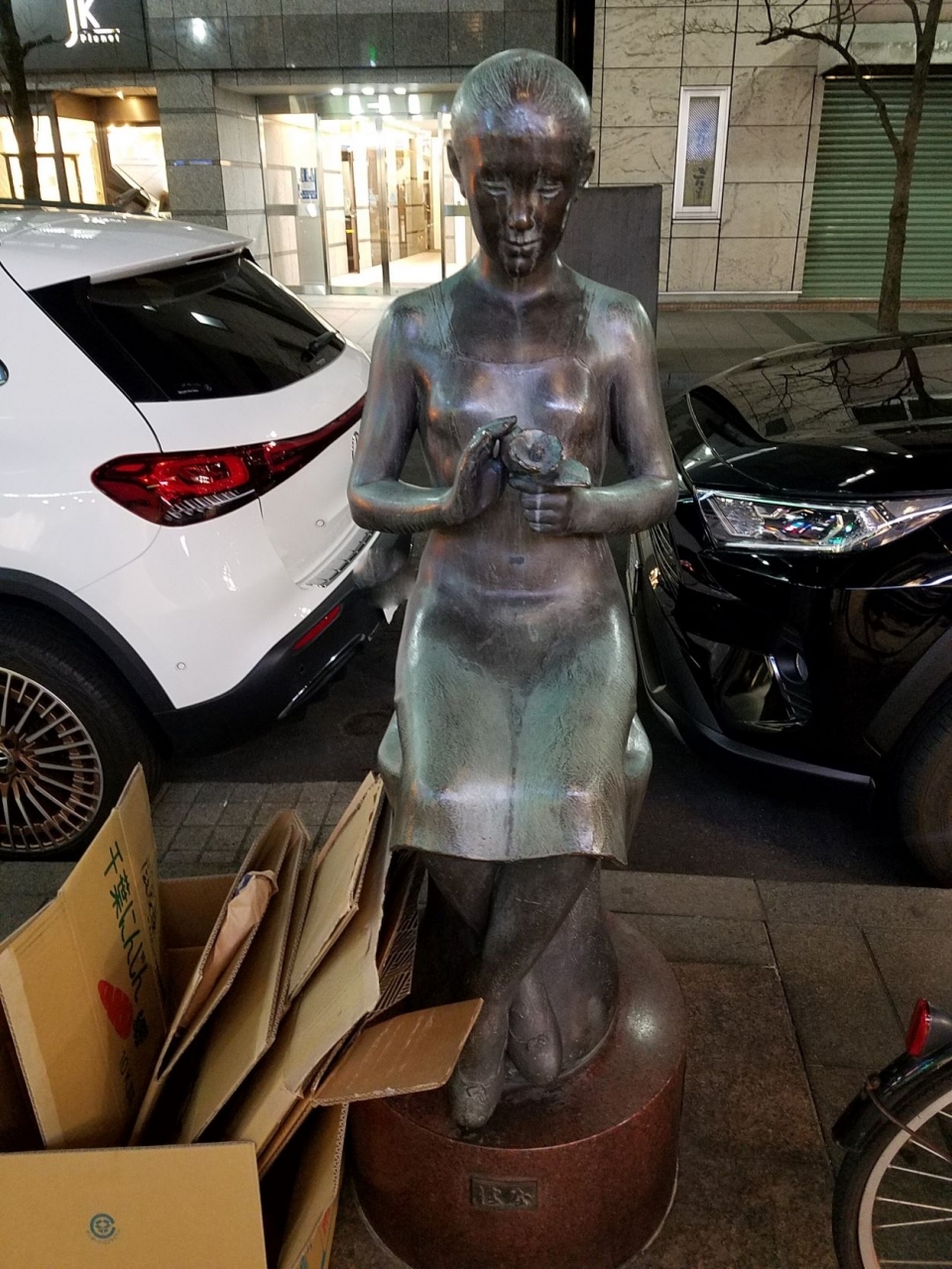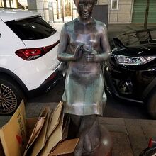 花椿通りの銀座羊屋というジンギスカン料理屋さんの前の歩道にありました。「はな」さんが椿を持っているという像なのですね。花椿通りだけに。平日の19時前という時間帯のせいかもしれませんが車が駐車しているわゴミのダンボールが横にあるわでちょっと残念な絵面になってしまいました。