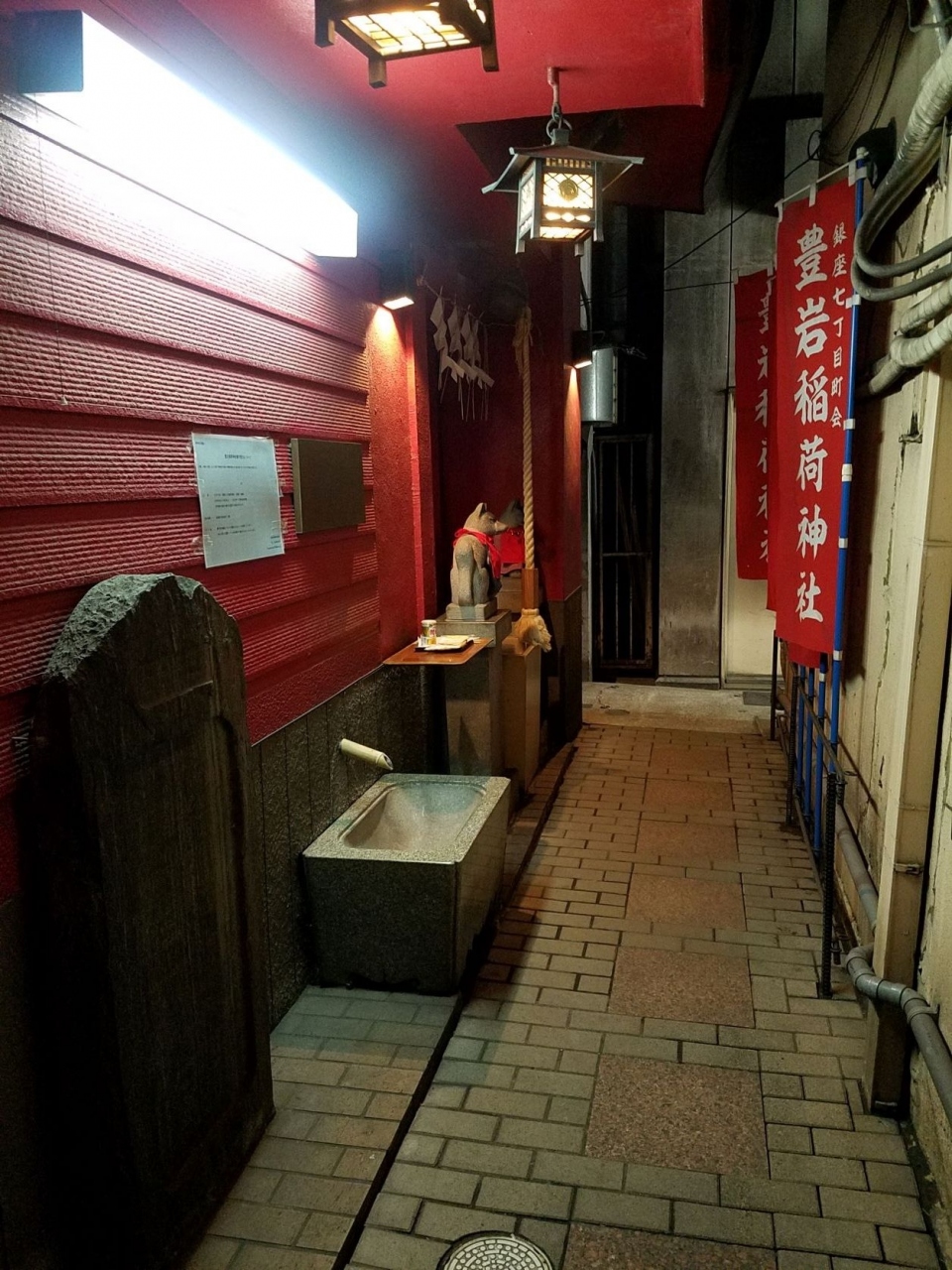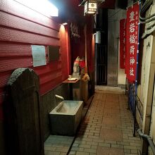 花椿通りから鈴らん通りに入ると歩道に社号標がありました。そこからビルとビルとの間を覗いてみると赤い幟が見えたので勇気を出して進んでみると稲荷神社でお馴染みの狐が並んでいました。社殿があるのかないのか、よく見るとビルの外壁が赤く塗られているだけのようにも見えますが頭上には釣灯籠もあって独特な雰囲気がありましたね。