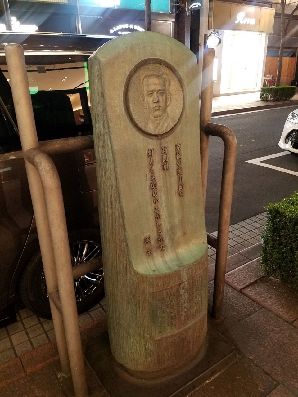 交詢社通りから並木通りに入ると歩道にありました。石川啄木と銀座というのはあまりピンと来ませんでしたが京橋の新聞社に勤めていたことがあるようですね。こだわりのありそうな形をしている碑ですが保護用なのか周りにパイプがあるのが無粋ですね。