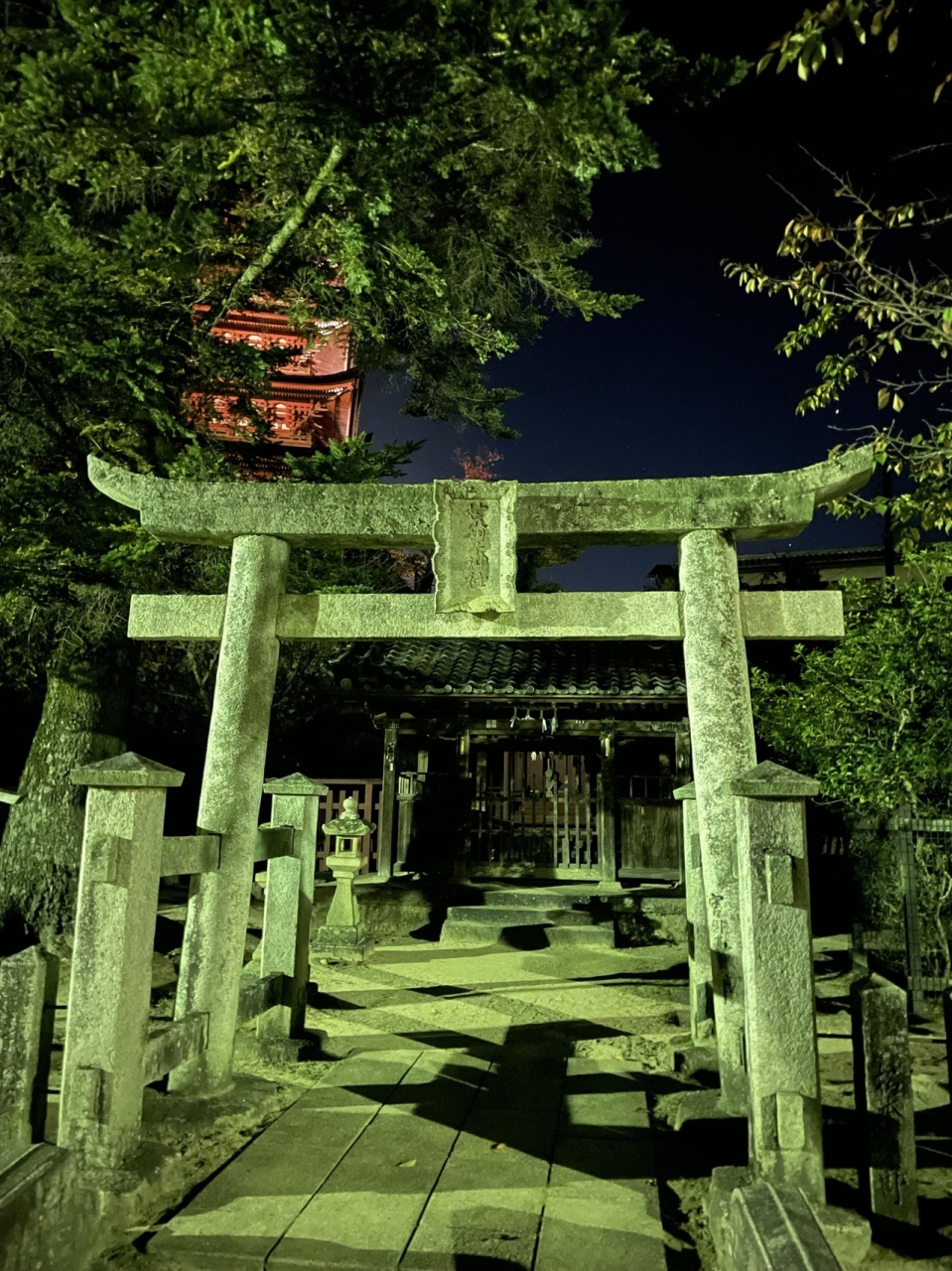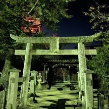 厳島神社の入口のすぐ前にあります。読み方は「あらえびすじんじゃ」だそうです。厳島神社の境内の外にある摂社になっています。夜、大鳥居のライトアップを眺めに訪れましたが、神社に灯りはなく、ひっそりしていました。