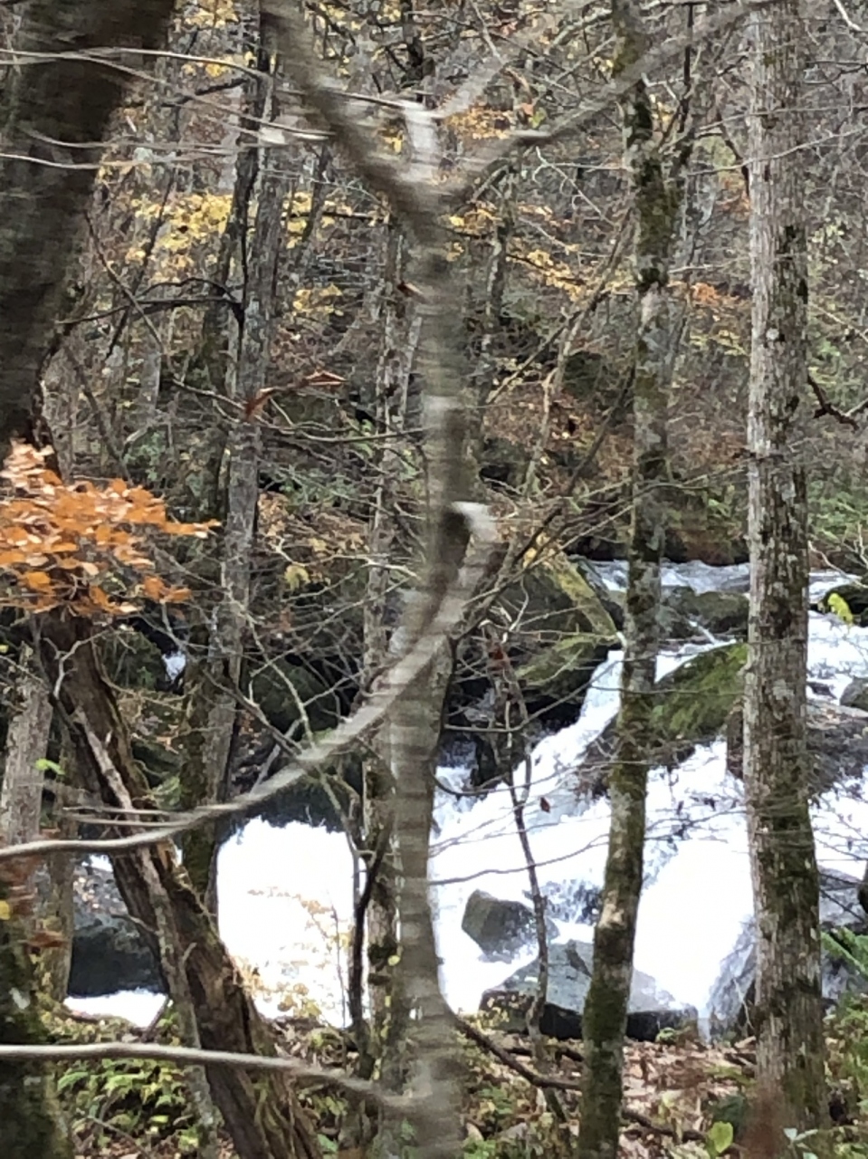 初冬で、枯れ枝が多く、また、水量も少なめなのか、迫力はあまり感じませんでしたが、岩にぶち当たって、白波を立てる流れは、それなりに、美しい流れでした。