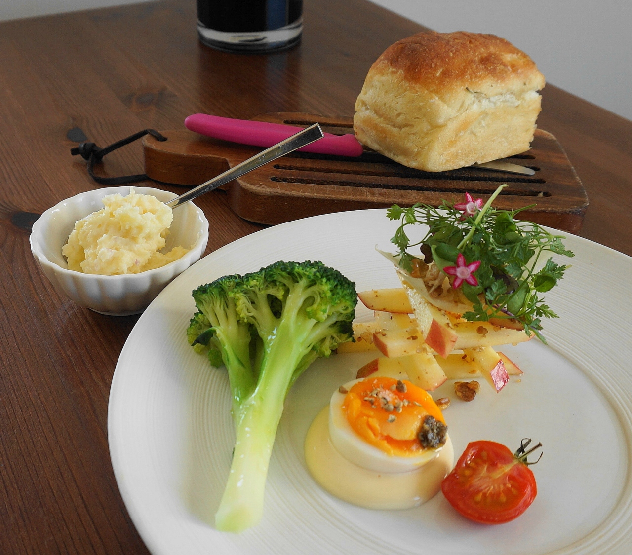 サラダのリンゴがフレッシュで美味、後で提供される大きなブロッコリーは卵とマヨネーズを混ぜて作るタルタルソースで頂きます、一味違う美味しさですね。