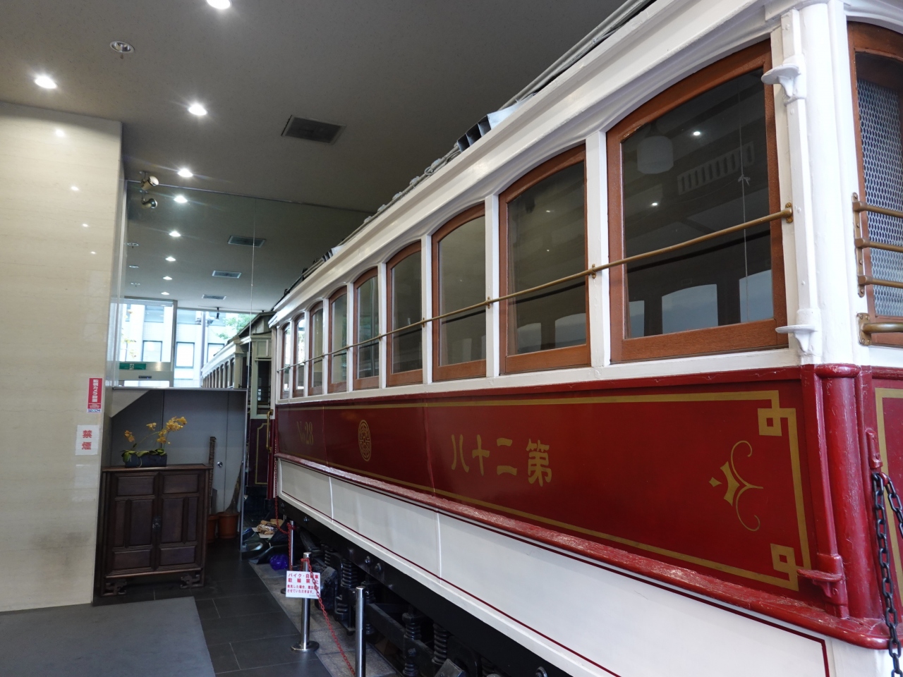 烏丸五条の交差点から烏丸通りを北上すると、左手にある「北阪ビルディング」の1階に京都市電の車両が陳列されています。更にはビルの中に入ることが出来、ガラス越しではなく間近に市電の姿を見ることが出来ます。驚きであるとともに、鉄道ファンとしては嬉しい限りでした。