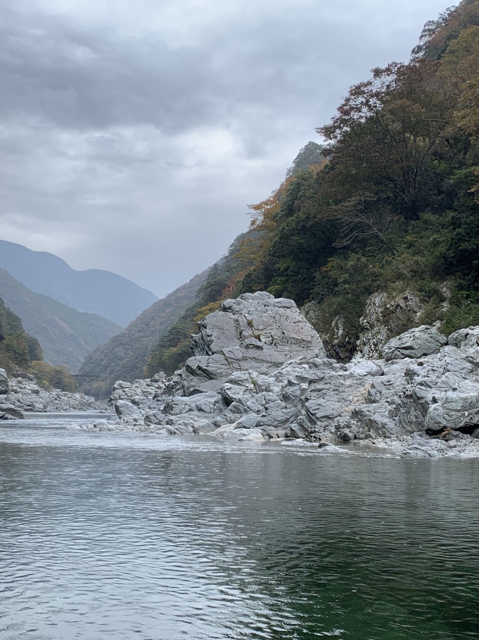 大歩危小歩危は2億年の時を経て四国山地を横切る吉野川の激流によってつくられた約8キロメートルにわたる渓谷で巨大な岩がそそりたっている景観がとても珍しく紅葉も綺麗でした。かわった名前の由来は断崖を意味する古語(ほき、ほけ)あるいは大股で歩くと危ないから大歩危、小股で歩いても危ないから小歩危といういろんな説があるようです。確かに巨大岩石や切り立った谷はとても見ごたえありました。
