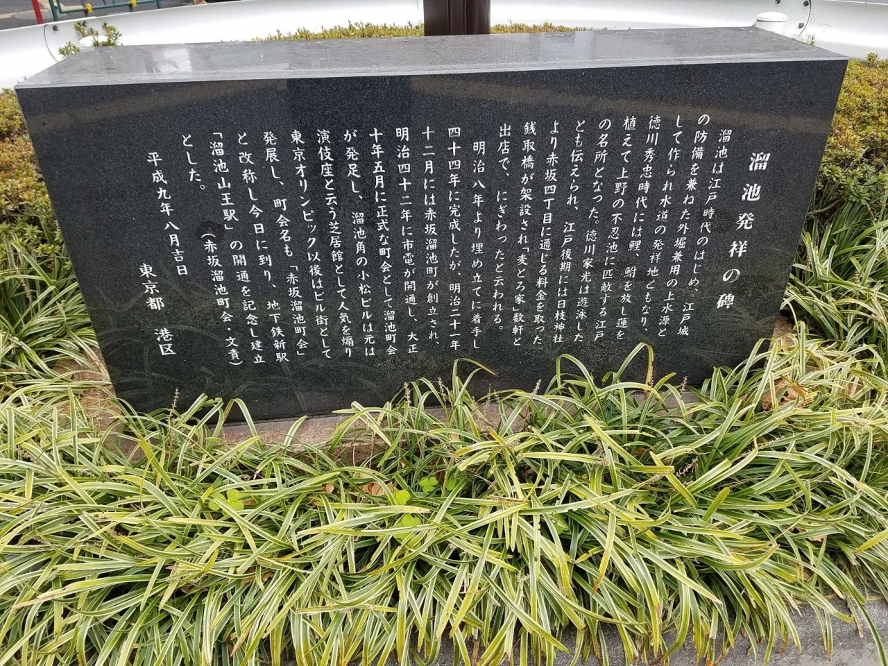 溜池交差点の歩行者用の小さな三角の島みたいなところにありました。溜池といえばすっかり溜池山王駅として認識してしまっていますがやっぱり池があったのですね。江戸城の防備を兼ねていたとのこと。為になるいい碑だと思いますが場所柄ゆっくりと見る人が少なそうなのが残念です。