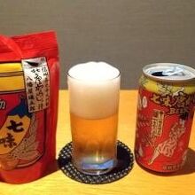 この七味唐辛子ビールと七味味の柿の種を購入してホテルで楽しみました。