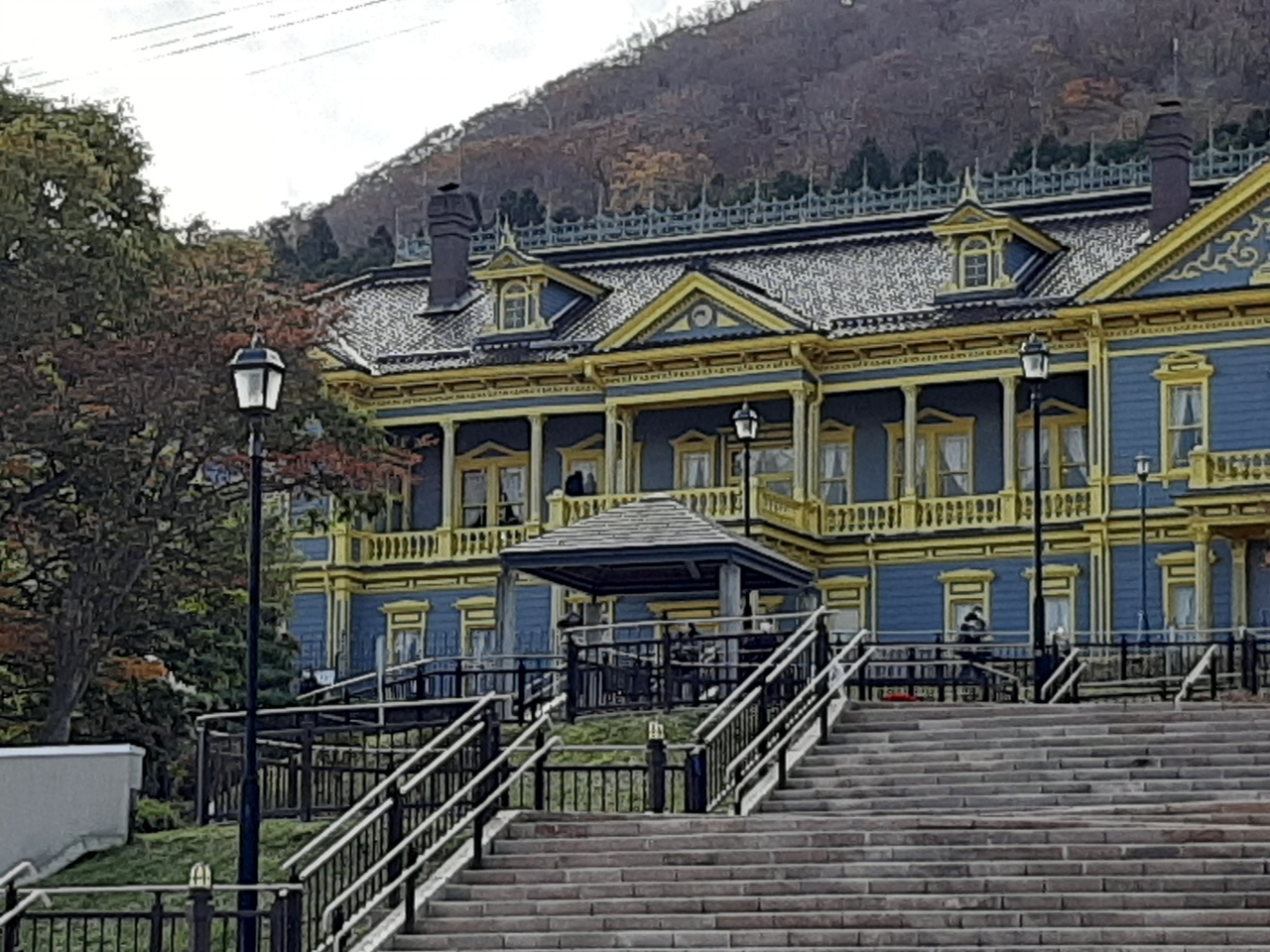 明治43年に建築された「旧函館区公会堂」で重要文化財に指定されているそうです。 ブルーに黄色の縁取りのある建物はとても美しい外観でした。
