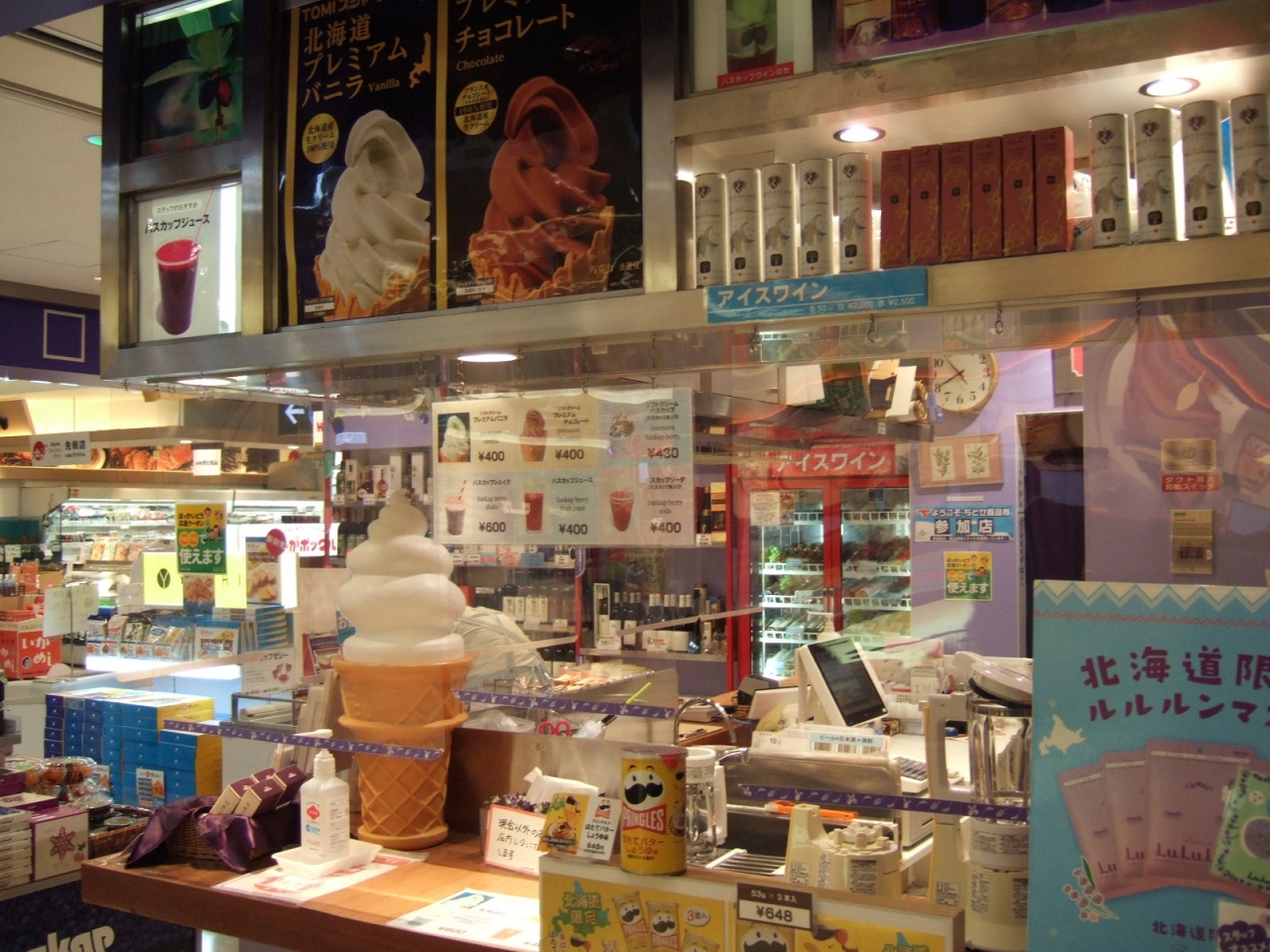 新千歳空港の国内線ターミナルビル2階、国際線に向かう通路の入り口近くにあるお土産屋さん。苫小牧周辺の特産品である、ハスカップという果実を使ったお土産がそろっています。