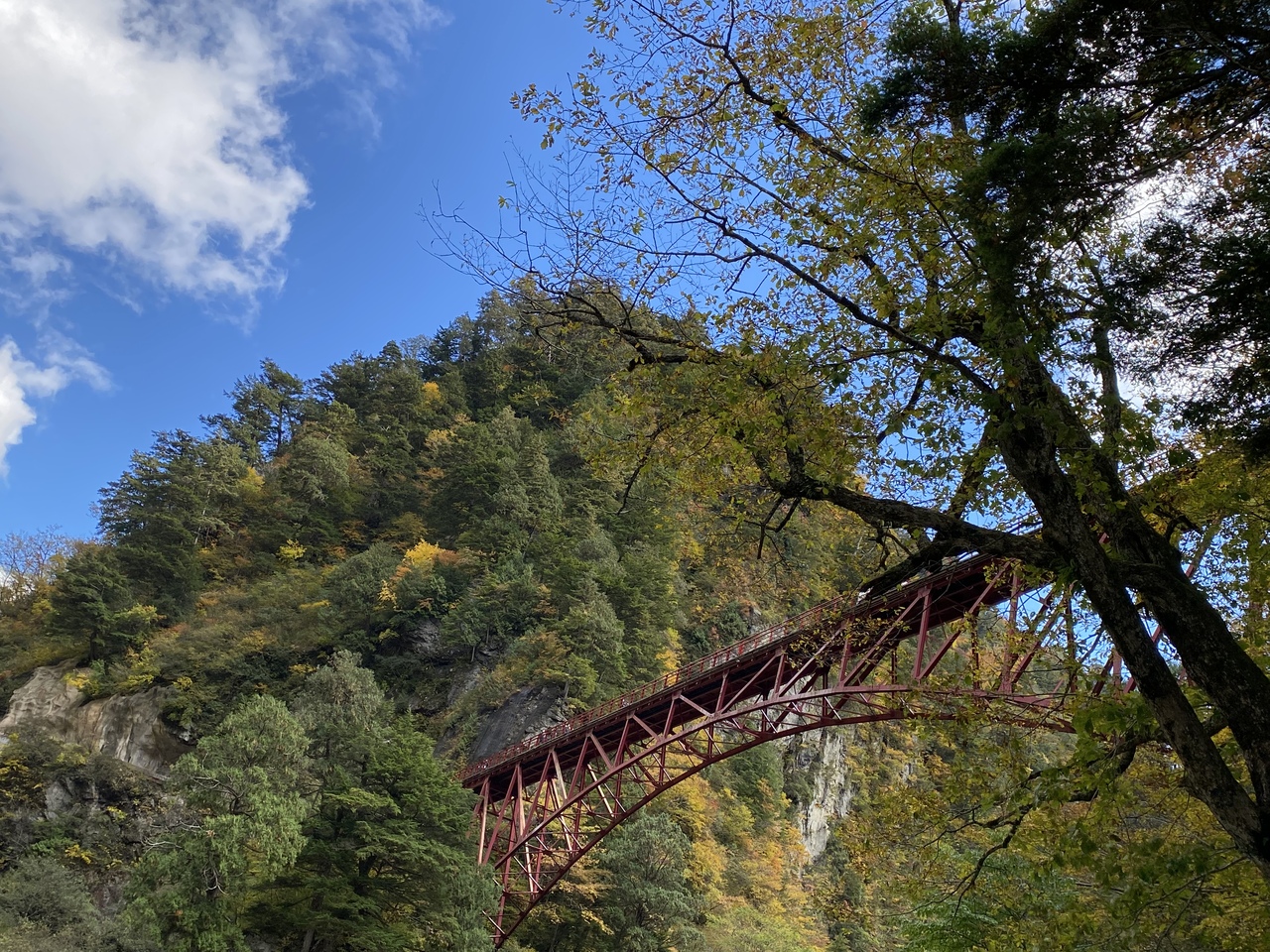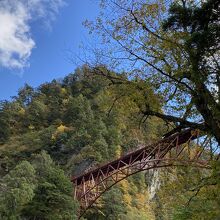 欅平駅から人喰岩に行く時に渡った橋です。朱色の鉄筋の橋で、歩行者専用でした。橋を渡った先には、人喰岩がありました。橋が架かっている渓谷まで下りていくことができます。渓谷から赤鐘橋を見ると、橋が渓谷から高い位置で架かっていることがわかります。