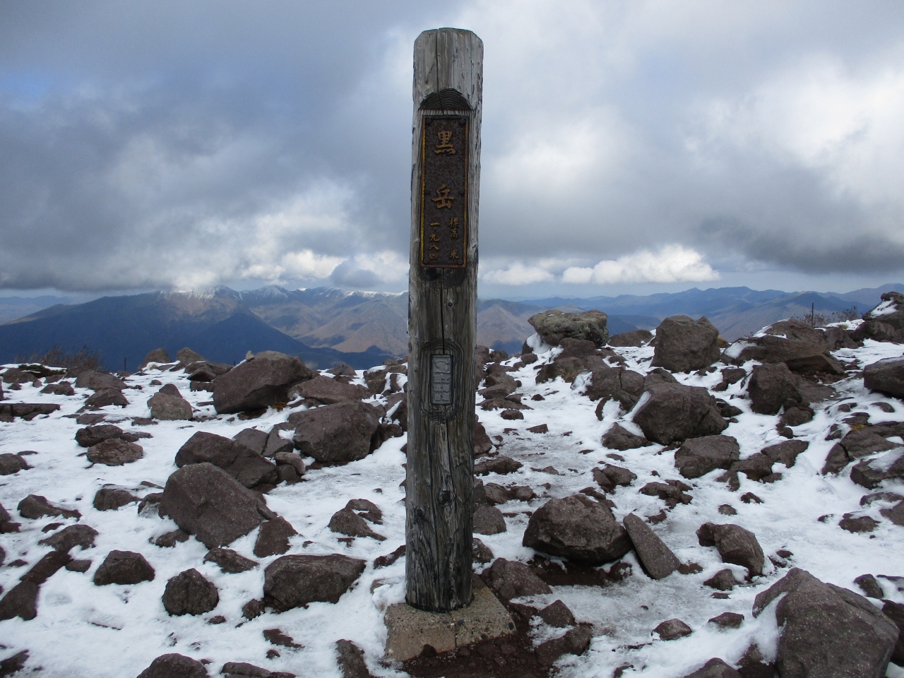 7合目より黒岳頂上を目指しました。1時間半後、やっと頂上に到着しました。頂上には団体登山客がいました。天候は良好でしたが、黒岳山頂は日本でもっとも早く雪が降る場所のひとつで、10月初めの週末でしたが雪が積もっていました。