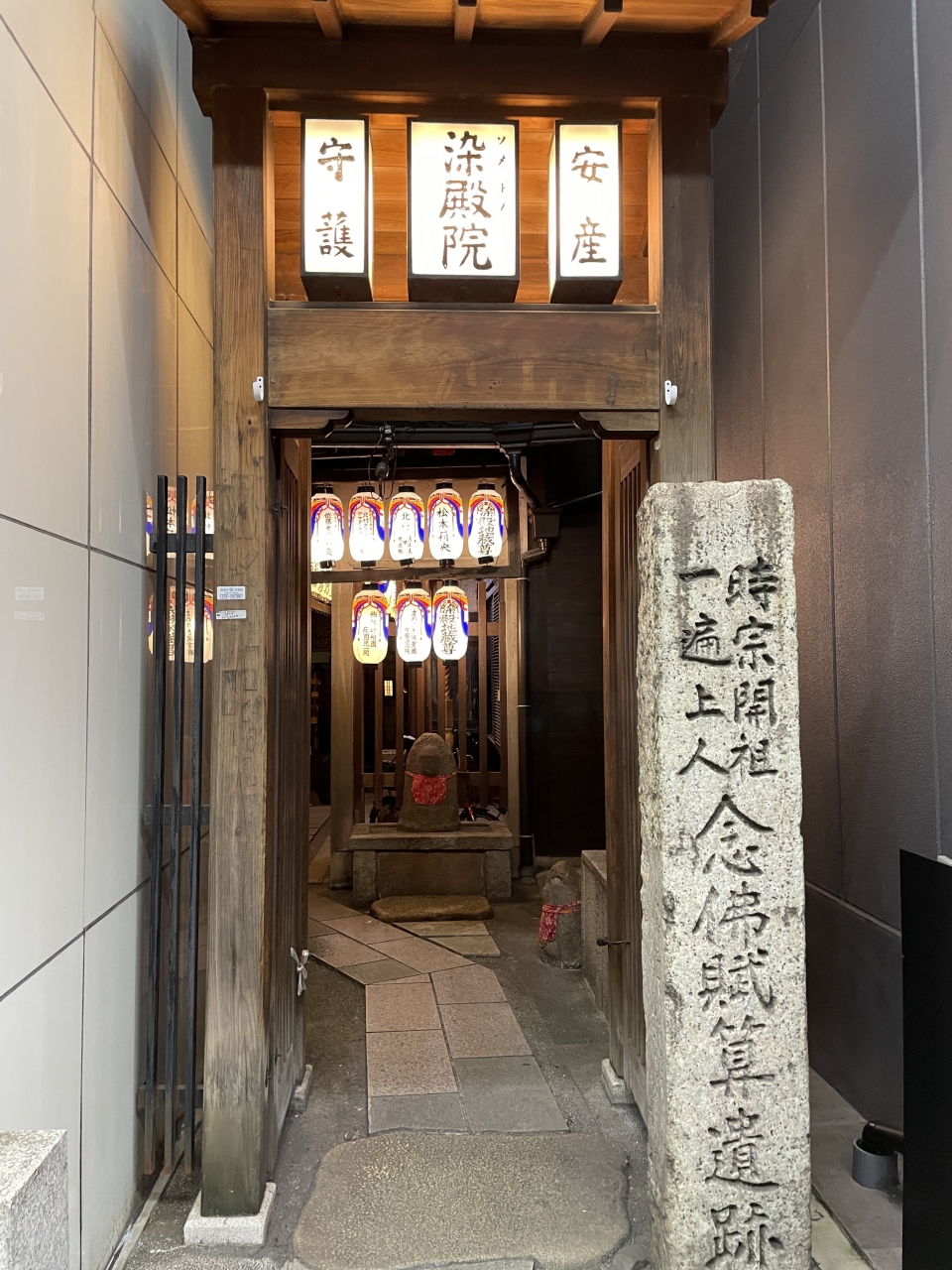 四条通りから新京極通へ入って進むと、ビルに挟まれた小さな入口があります。808年に弘法大師・空海により創建された歴史ある寺院です。文徳天皇の皇后藤原明子(染殿皇后)が、安産祈願をして清和天皇を産んだことから「染殿院」と名が知れ渡るようになったそうで、安産祈願にご利益があります。
