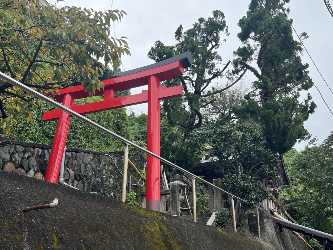熱海から湯河原に向かって1.5キロのところ、熱海ビーチライン沿いに走り湯の大きな案内板があり、横穴式源泉(石の洞窟上になっている)があります。この洞窟のすぐ上に、走り湯の源泉を守るような形で、走り湯神社の真っ赤な鳥居と拝殿があり、拝殿には「走湯神社」と書かれた扁額がかかっています。