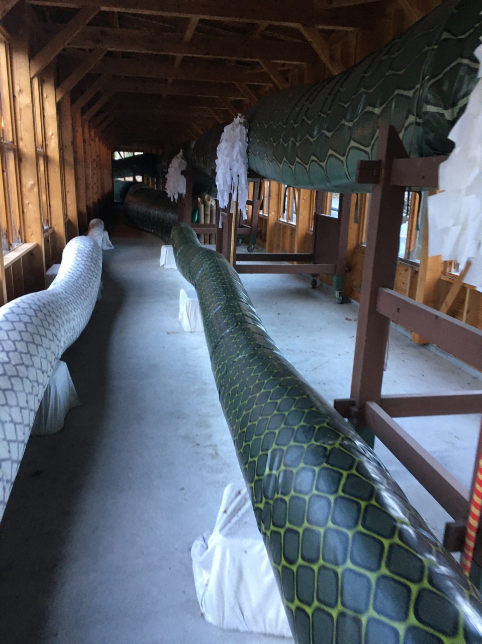 老神温泉のそばにある朝イチマーケットに行ったら、赤城神社例大祭で使用する蛇が飾ってありました。老神の湯を見つけてくれた神様だそうです。かなりの長さで、ギネスブックにも登録されているようでした。面白かったです