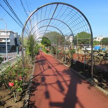 東西線・南行徳駅北口から5分ほどのところに造られた、広々とした高低差が少しある公園です。園内には水が流れ落ちる噴水やじゃぶじゃぶ池、バラ園、ローラーすべり台、丸太わたりやロープ上りが楽しめる木製のアスレチック遊具、魚やキノコの形をしたベンチなどが造られていて、多くの園児が遊びに来ていて歓声を上げていました。一部工事中でしたが、防球ネットが設置された野球グランドも造られていました。グランドやアスレチック遊具、ローラーすべり台など、子どもたちが楽しめる遊具がたくさん造られている公園です。