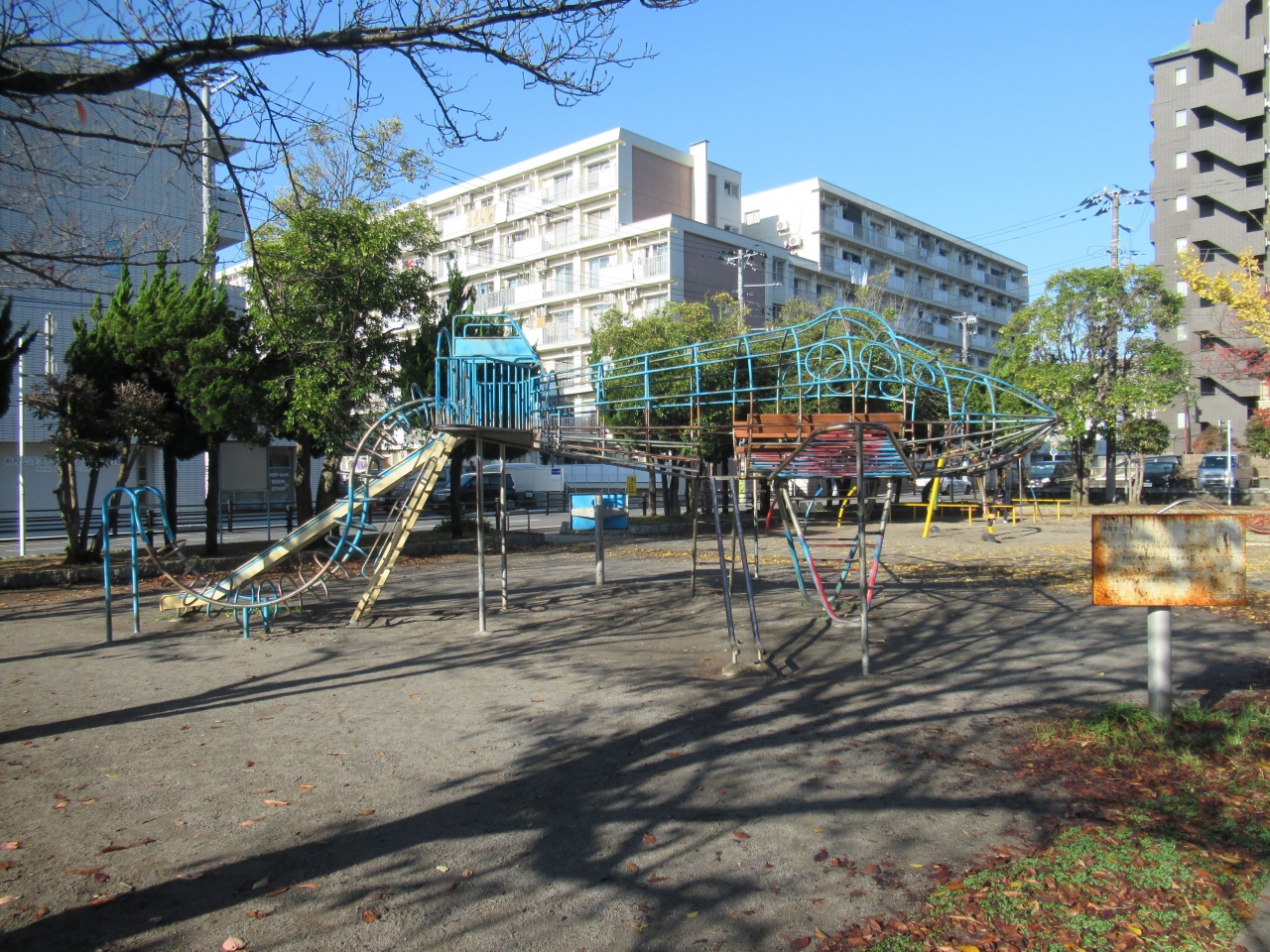 東西線・行徳駅北口から5分ほど、かもねぎ商店会沿いに造られている公園です。すべり台とジャングルジムが一緒になった飛行機型の遊具や、シーソー、ブランコなどの遊具が設置され、幼児が走り回れる砂地の広場が造られています。園内には桜が多く植えられ、イチョウも黄色くなっていました。かつて公園周辺は水田や蓮田が広がり、その中にあった森に弁財天が祀られていたことから、公園の名がついたそうです。現在も樹齢180年ほどのクスの木をはじめ、エノキやクロマツなど多くの樹木に囲まれて、社に守られ弁財天が祀られています。