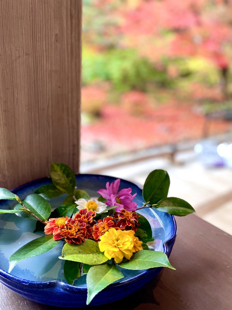 所々にあるお花が可愛いです。何と言っても紅葉が綺麗。勅使門から見える紅葉が色鮮やかでした。本堂から眺める庭園に鹿おどしの音色がよく響き渡っていました。新しいご朱印帳を購入しましたが、見本以外の模様も出してくれます。