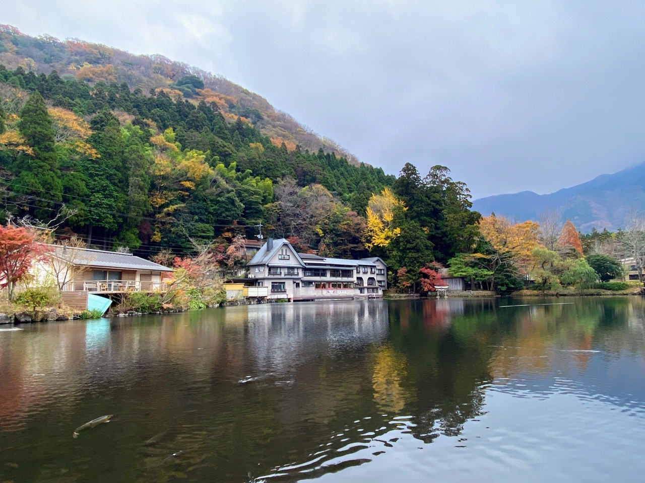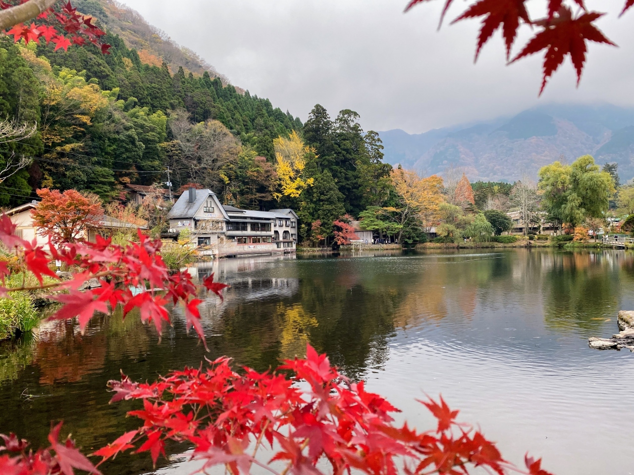 由布院と言えば「朝霧に包まれた幻想的なイメージの金鱗湖」でしたが 私は、日帰りでお昼の訪問の為 幻想的な雰囲気はなく 紅葉の見頃でしたので「カラフルな金鱗湖」が楽しめました。