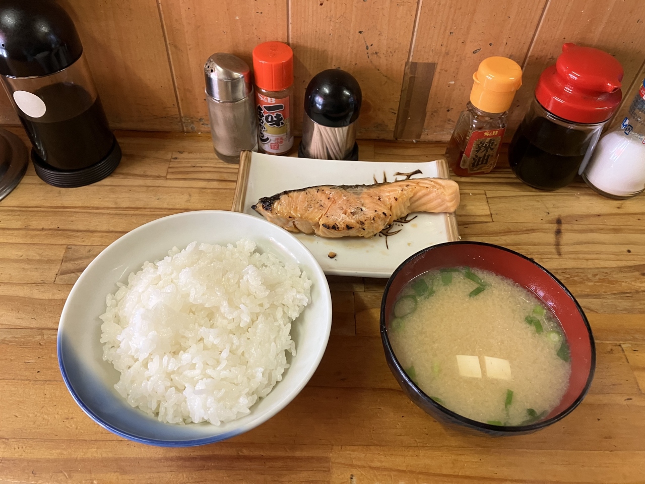 ご飯130円、みそ汁80円、焼鮭で朝食を