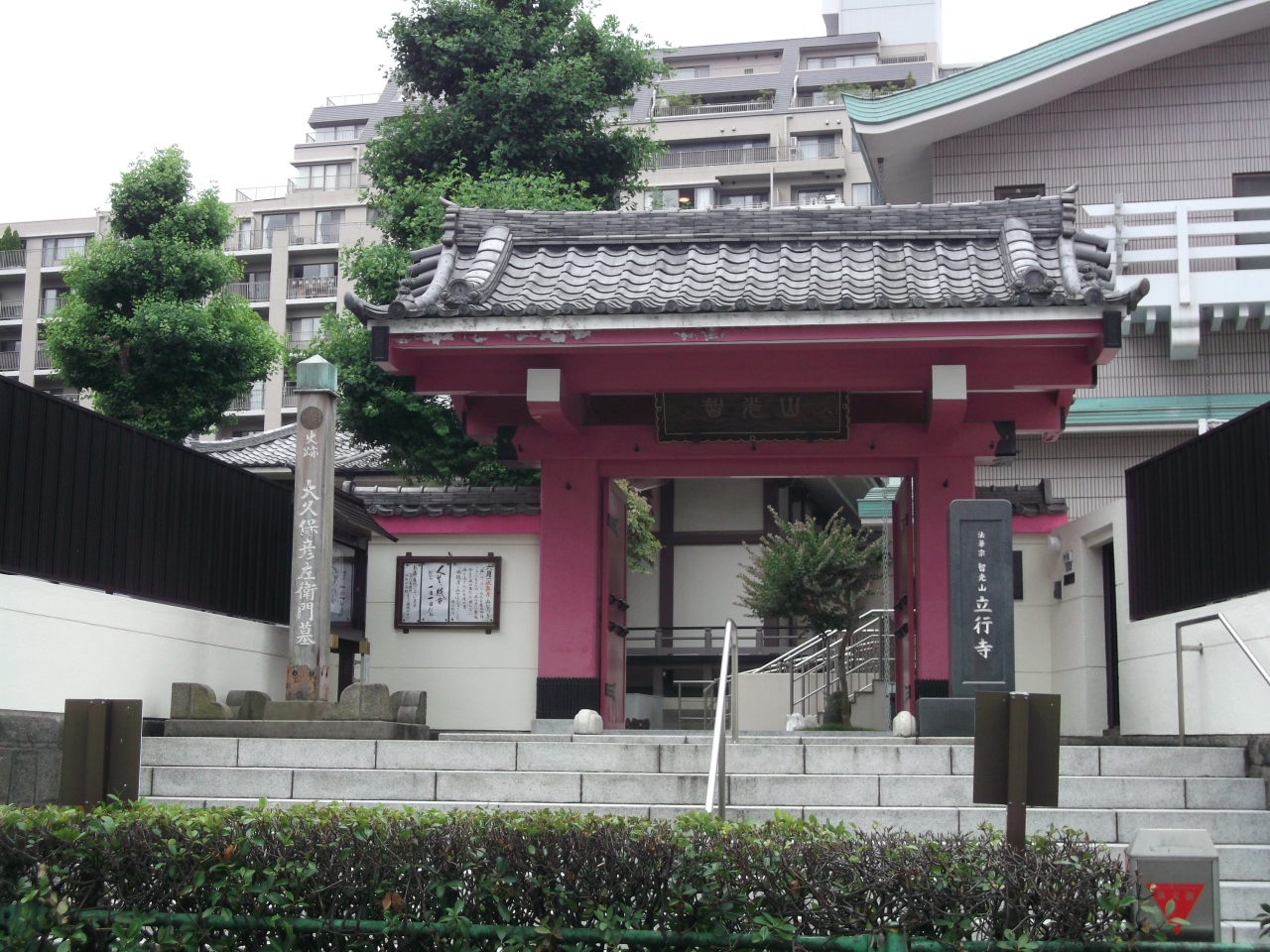 地下鉄白金高輪駅から歩いて3分ほどのところにある法華宗の寺院です。堂々とした造りの山門は柱や梁がピンク色で、とても目立って見えます。門をくぐりぬけるとすぐ本堂があり、かなり大きな現代風な構造の建物でした。