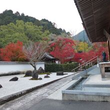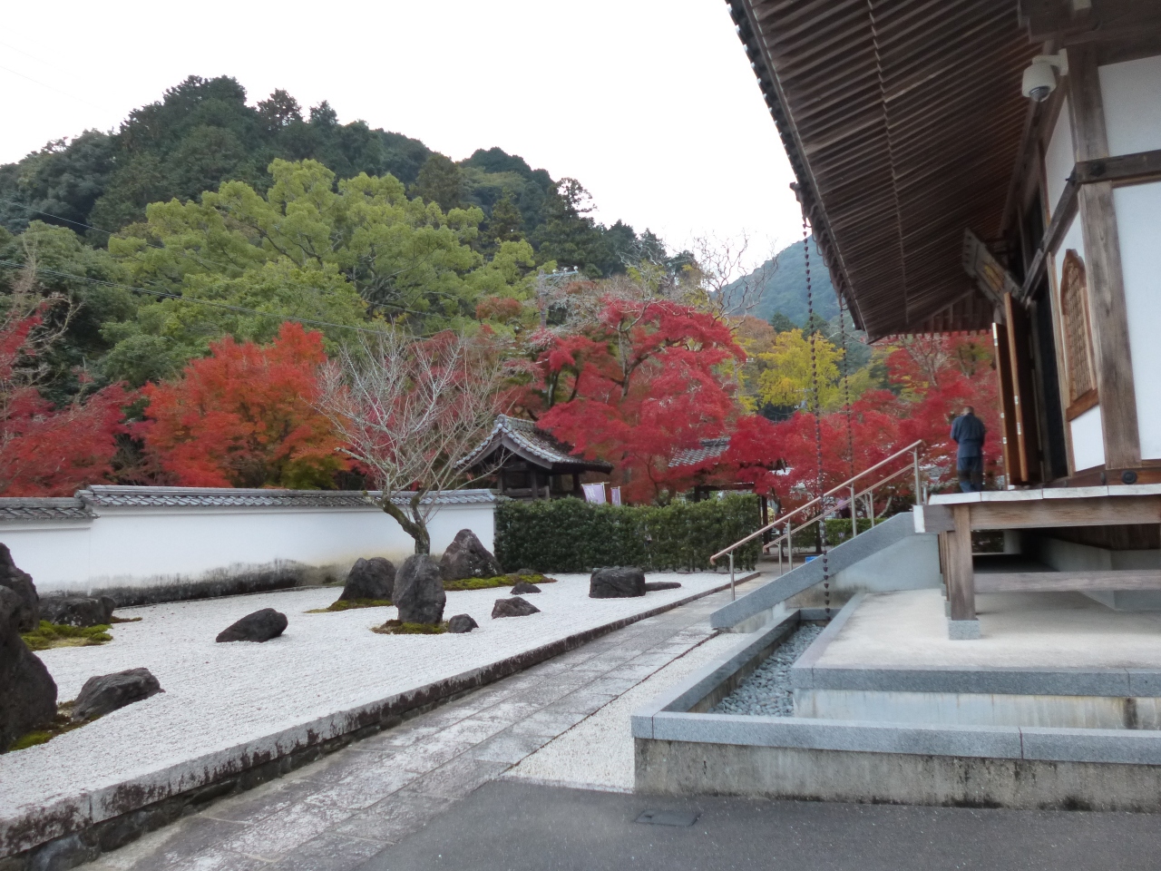 錦帯橋の近く、吉香公園の中に紅葉谷があります。その一角に永興寺があります。門の向こうに鮮やかに色づいた紅葉のトンネル、中に進むと、塀の向こうの鮮やかな紅葉を借景にした、白石を敷き詰めた枯山水がありとても印象的な光景です。休日でもあり、割合いと人は多かったですが、ゆっくりと散策することはできました。