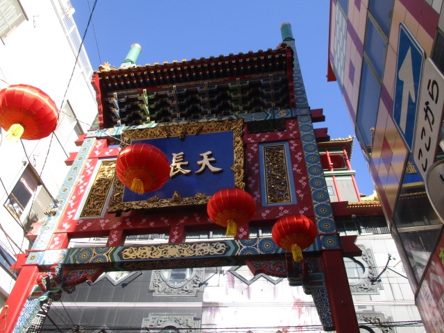 横浜中華街の関帝廟通りにあり横浜大世界の前に赤と金色を基調の牌楼がありました。朝陽門が朝日を迎え街全体に繁栄をもたらす意味に対して天長門は天の永遠に商売繁盛が続くようにとの願いがこめられているそうです。天長門の通り沿いには中華調味料などを販売している専門店が多いと思いました。 スタジアム方面に天長門と同じようなデザインの地久門がありました。