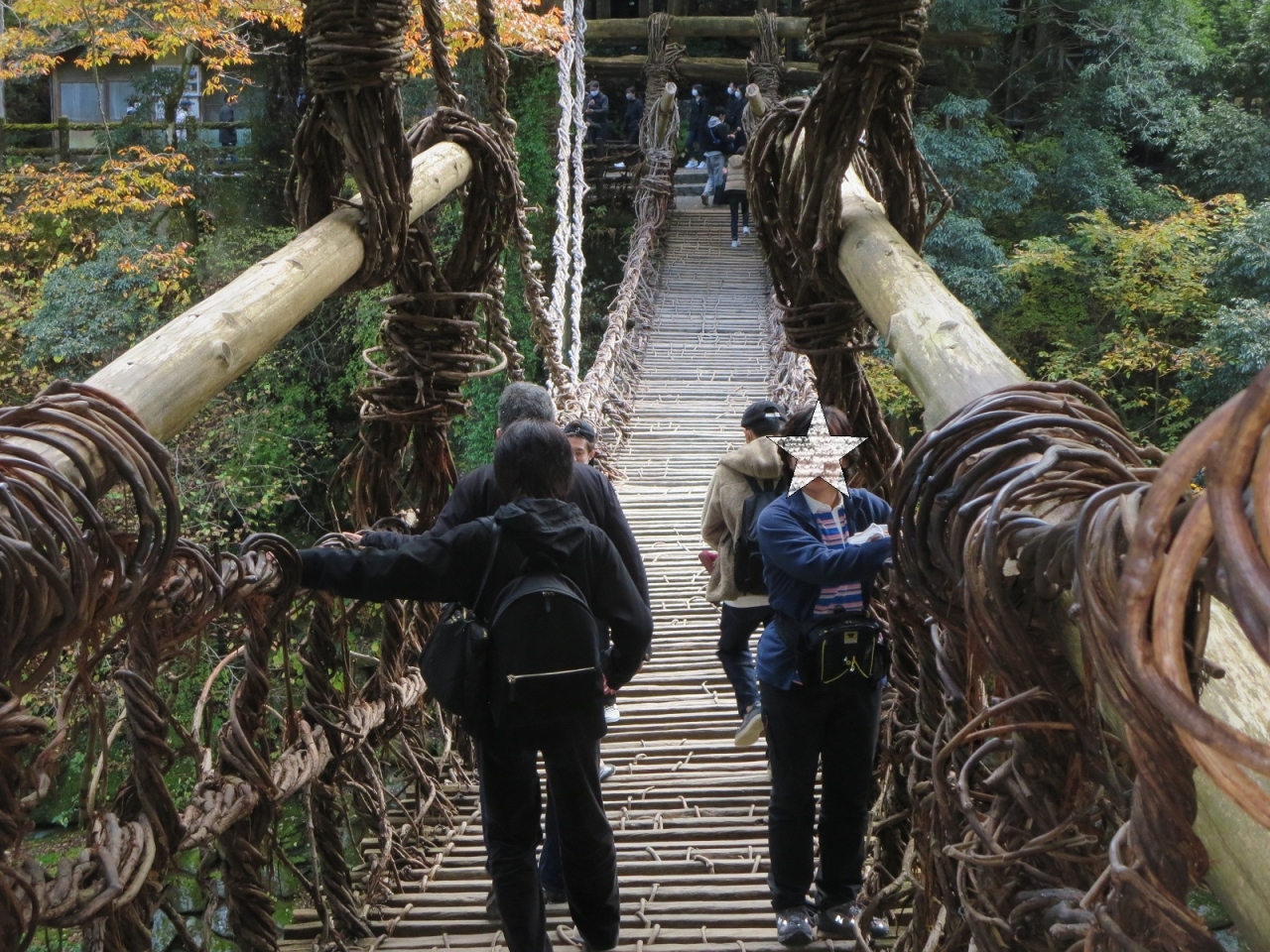 祖谷のかずら橋は、源平の戦いで敗れた平家のの落人が源氏の追っ手を逃れるために山里深く入り込み隠れ住んだという伝説が残る祖谷地方にあります。かずら橋は長さ45mあり、川から14mの高さにかけてあります。3年に一度架け替えされるそうですが、約6tのシチクカズラが使用されるそうです。渡るのは揺れる上に真下の川が見えますからなかなかスリル満点です。
