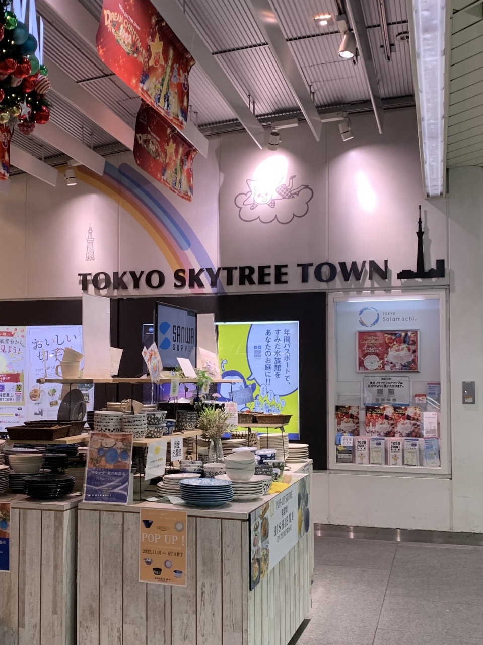 電車を降りたら直接スカイツリータウンにつながるようになっています。雨でも濡れずにスカイツリーまで行けるのはよいです。スカイツリータウンへの入り口で陶器市を開催していました。好きなお皿が見つかり思わず購入しました。
