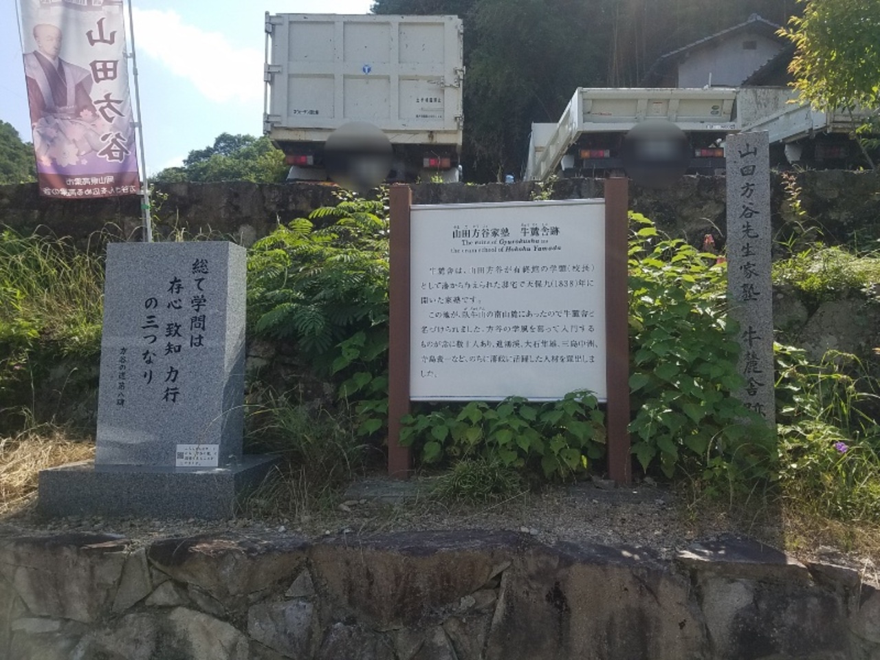 武家屋敷通りから備中松山城を目指して歩き始めると山の勾配にさしかかった辺りにありました。石碑と説明板に幟がはためいていて一見賑やかですが建物などはありません。山田方谷が開いた家塾だそうで難しい名称の割には臥牛山の麓にあるからという分かりやすい由来でした。