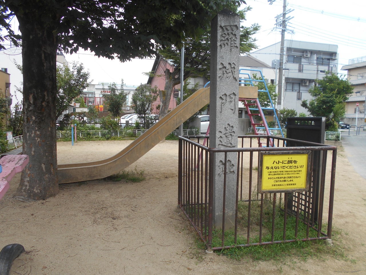 東寺から歩いて10分程、かつての都の玄関は児童公園になっていました。碑が立っている以外には羅城門の跡だと想像できるものはなにもありません。周囲は住宅地になっていて、歴史を感じることができない。道路のつけてある位置が不規則に曲がっているので、なんとなくここに門があったのかなあとは感じます。