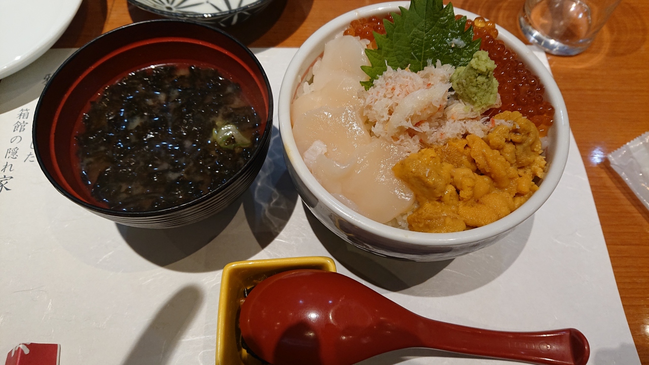 うに、いくら、カニ、帆立4種の海鮮丼(雅家丼)を頂きました。特にうにが甘くてとても美味しかったです。ホテルのクーポンで頂いたイカ刺しもとっても新鮮で美味しかったです。