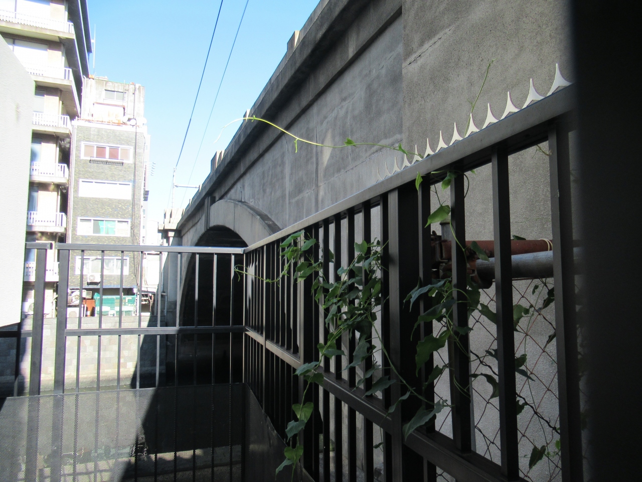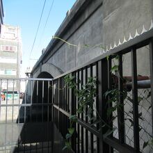 JR秋葉原駅と神田駅の間のJR列車が走る線路下には、いくつもの架道橋や高架橋が造られています。観光施設とは言えませんが、この高架橋もその一つで、秋葉原駅中央改札から3分ほど、神田川に架かる神田ふれあい橋を渡った右側にある柳原通ガードのすぐ横に造られています。橋の名称が書かれたプレートはなく、橋の手前には小さな建物や進入禁止のための金属製の柵があり、近づいて見ることはできませんが、わずかながら柵越しに神田川を見ることができました。