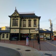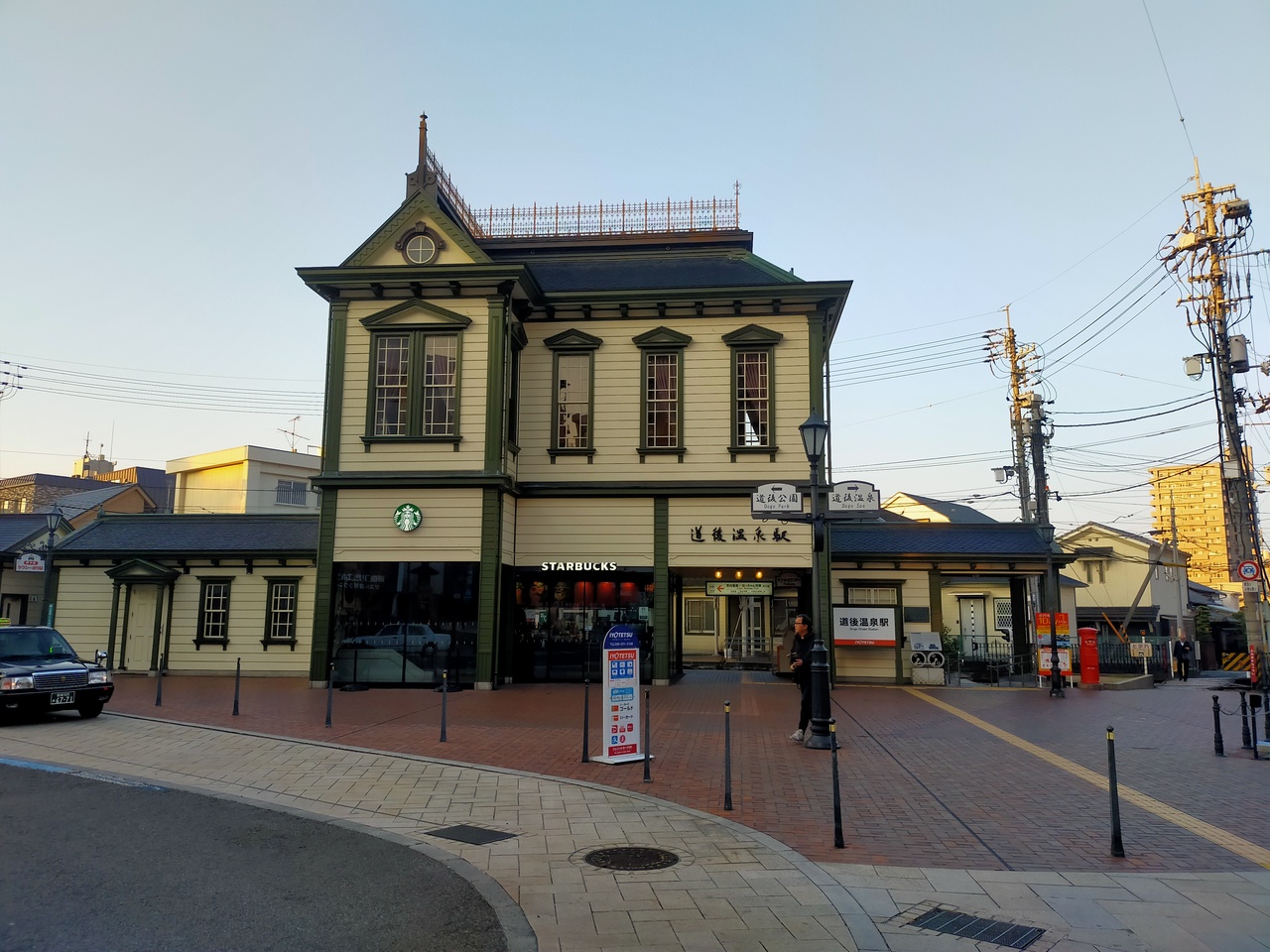 道後温泉の玄関口。路面電車の終着駅です。駅舎は開業時の駅を模した復元駅舎で、スターバックスが入っています。駅前には坊っちゃん列車の車体が展示してあり、同型の車両に乗って夏目漱石は松山の街に過ごしたのでしょう。車体には伊予鉄のマークもしっかりありました。
