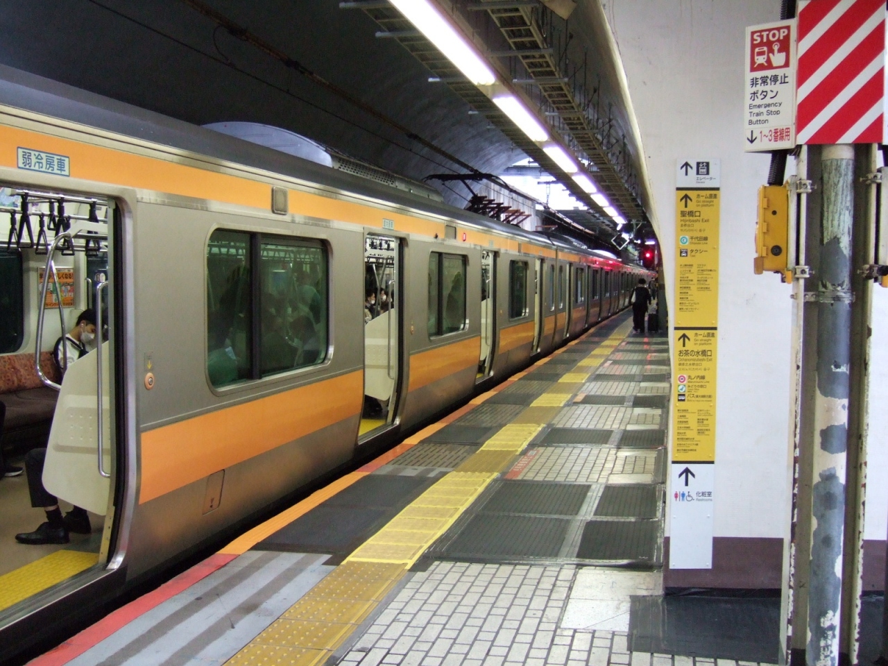 御茶ノ水駅のホームは聖橋をくぐっている場所もあり、かなり狭かったです。