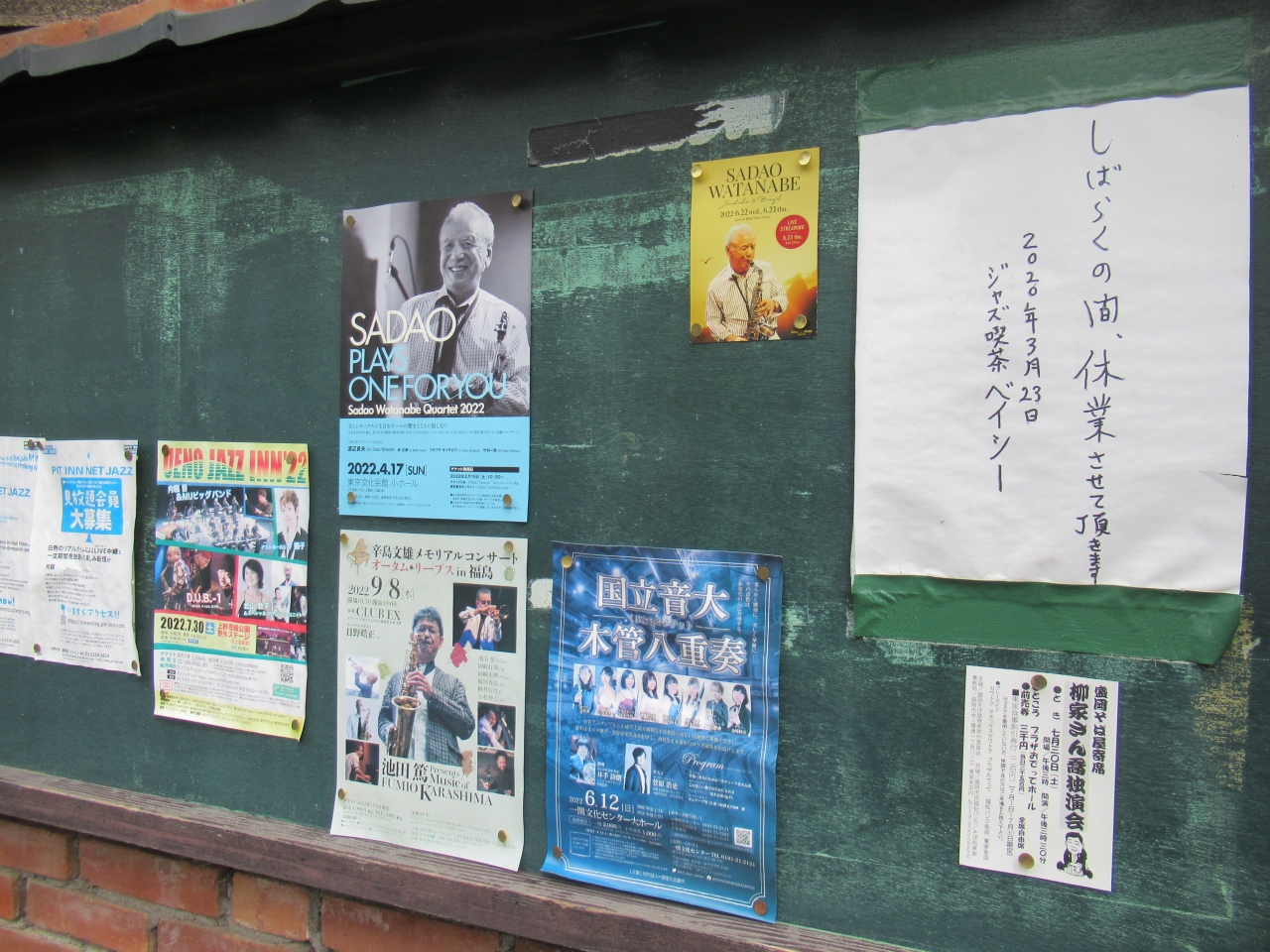 現在は休業中との情報がありましたが、2022年の7月にダメ元で行って見ると入口のドアに「しばらくの間。休業させて頂きます。2020年3月23日 ジャズ喫茶ベイシー」との張り紙がありました。