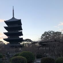 東海道新幹線が京都駅に近づく頃に見える五重塔をもつお寺。