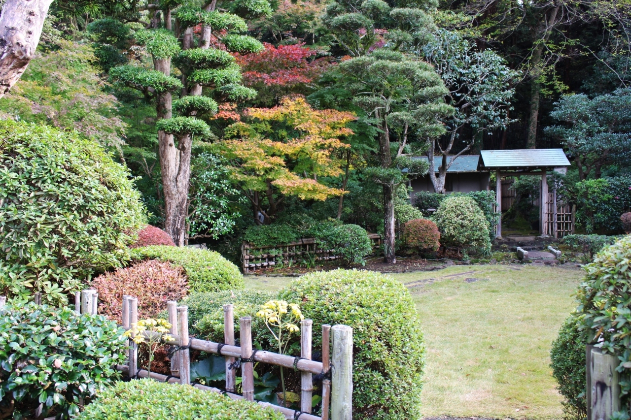 旧三井別邸地区は小高い山のような地形で結構坂や階段が多く、何ヵ所かある広場以外は樹木に覆われている。不動池の付近にもみじの木が多く秋は美しい。