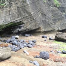 矢堅目の奇岩を対岸から望む展望所から、赤タギ断崖を見下ろすようによく見えました。この先津和崎方面に少し進んだ箇所で、断崖は、ここが大規模な火山の噴出口であったことを今に残しており、学術的にも貴重であることから昭和53年に長崎県指定天然記念物に指定されています。