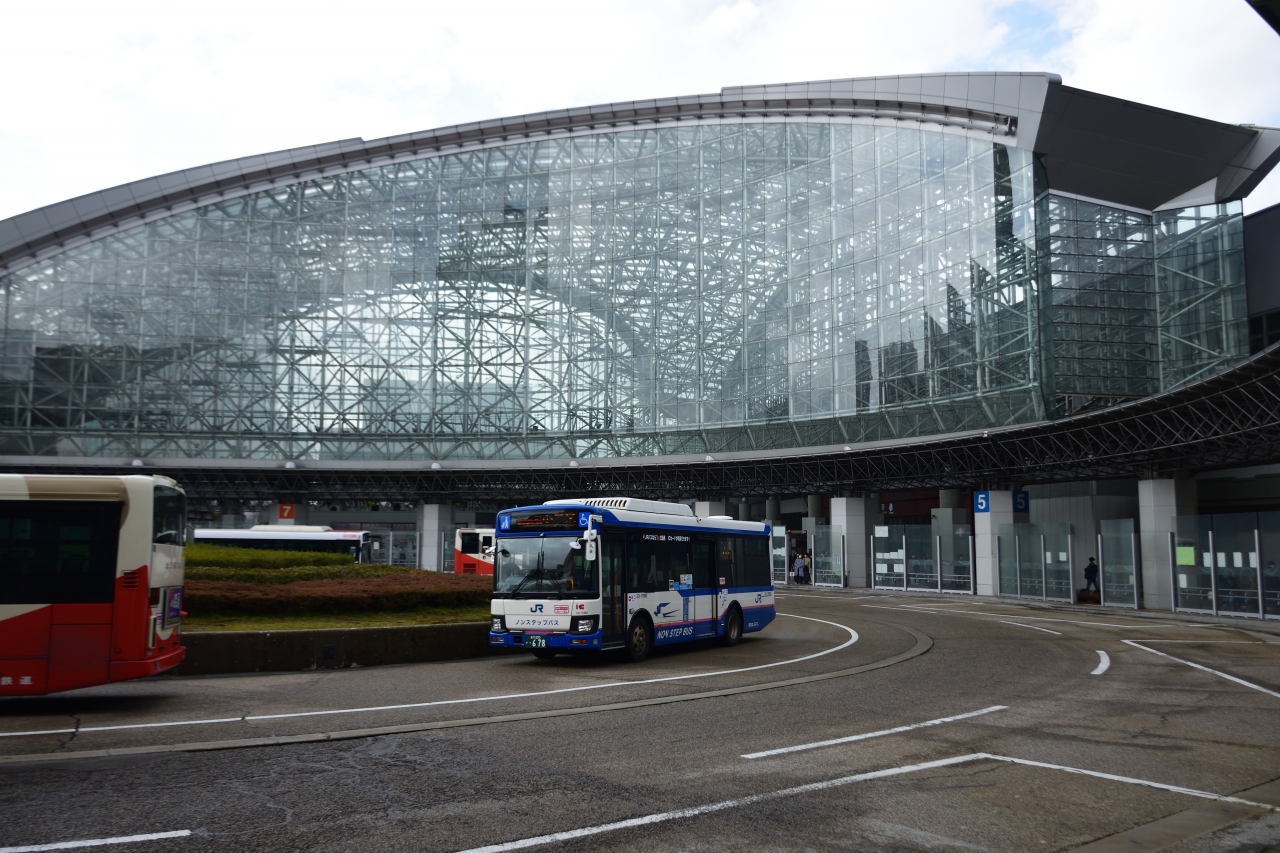 金沢駅の前にあるバスターミナルです。金沢は鉄道以外にはバスが中心の交通機関となるため、バスターミナルが充実しています。市内線はもちろんのこと、近隣の都市へと結ぶバスや、東京などと結ぶ長距離路線のバスも発着しています。