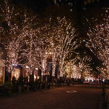 東京駅と有楽町を結ぶ「丸の内仲通り」沿いの街路樹が、シャンパン色に輝くイルミネーションです。派手な音楽や色が変わったりする演出はありませんが、真っ直ぐな通り沿いにずっとイルミネーションが輝いているので、とても綺麗です。11月の平日に訪れたので、まだそんなに人出は多くありませんでしたが、イルミネーションを眺めながら散策していたら、あっという間に感じてしまいました。
